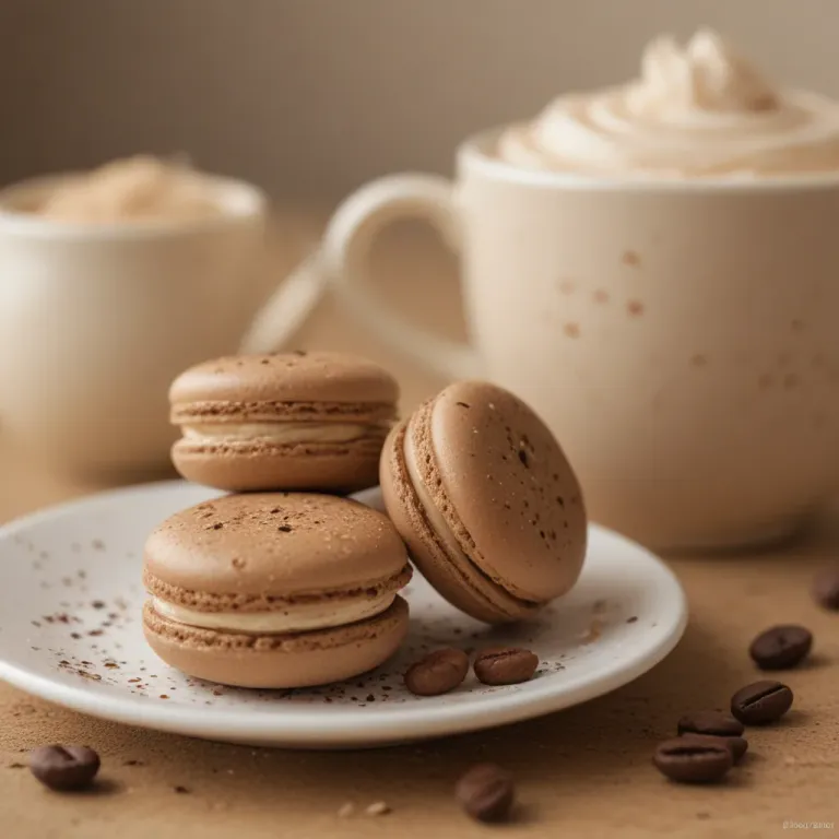 A close-up of chocolate macarons with a creamy filling, set against a backdrop of frothy coffee mugs and scattered coffee beans, creating a warm, inviting scene with soft, diffused lighting that highlights the textures and rich browns of the coffee and macarons.
