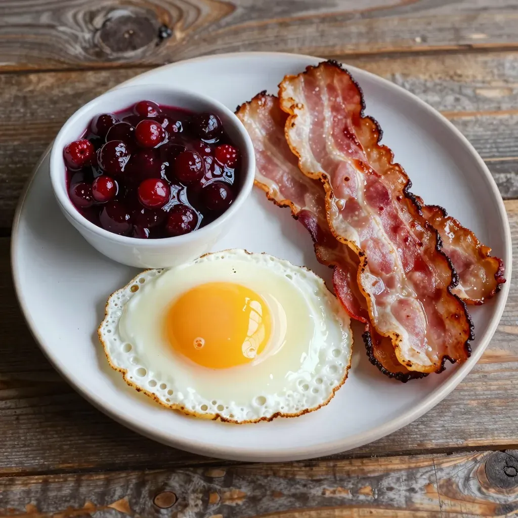 A beautifully arranged breakfast spread featuring crispy bacon, a sunny-side-up egg with a runny yolk, and a glossy berry compote, all set against a warm, rustic wooden background. The soft, natural lighting highlights the textures and vibrant colors of the food, creating a harmonious and appetizing composition.
