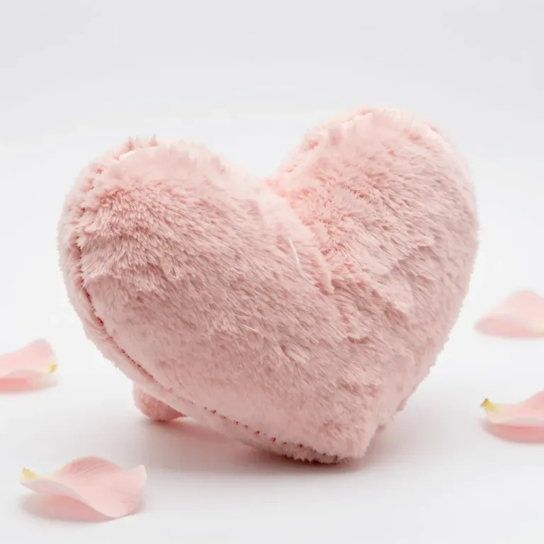 A soft, fluffy plush heart toy surrounded by delicate petals, creating a gentle and intimate atmosphere. The soft, diffused lighting highlights the texture and color of the toy, making it perfect for product photography and promotional materials.