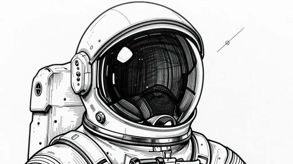 A close-up of an astronaut in a detailed spacesuit, with the glossy helmet reflecting light, set against a minimal white background. The high-contrast lighting highlights the intricate paneling and smooth texture of the suit, creating a striking visual impact.