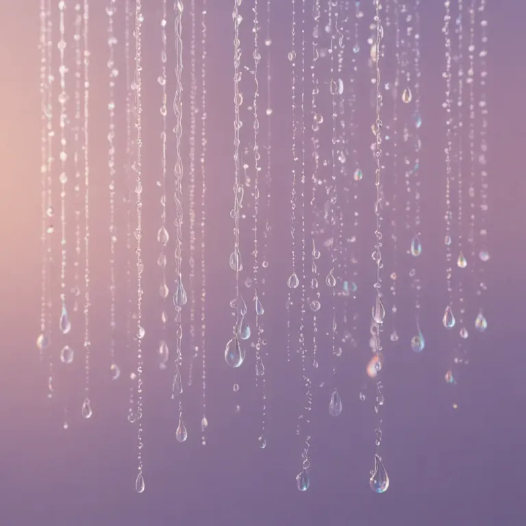 Iridescent prismatic droplets cascade vertically against a soft lavender gradient, creating a mesmerizing, ethereal effect. The diffused, soft lighting enhances the droplets' glossy, translucent texture, drawing the eye downward with a sense of depth and tranquility.