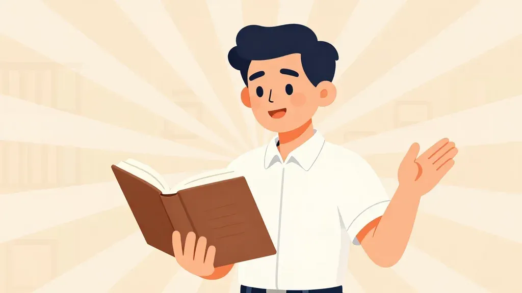 A young man with dark hair in a white collared shirt holds an open book, gesturing warmly with his left hand, his face illuminated by soft backlighting. The radial sunburst background in warm beige tones provides a clean, uplifting atmosphere with ample negative space for design integration.