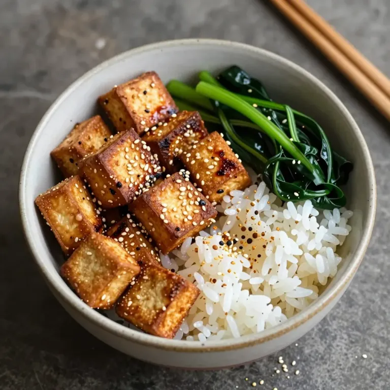 A bowl of crispy tofu, fluffy white rice with chili flakes, and wilted greens, bathed in soft, natural light that highlights the glossy texture of the tofu and the creamy rice. The neutral, dark gray background ensures the focus remains on the vibrant dish, creating a balanced and visually appealing arrangement.