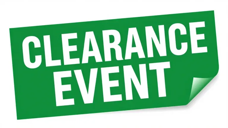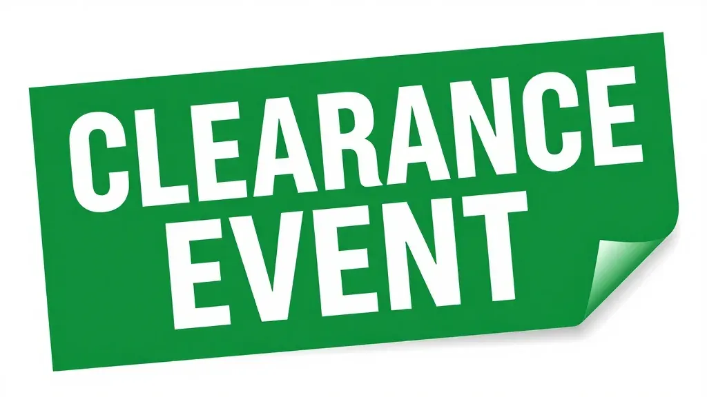 A glossy green clearance event banner with bold white text, softly lit to highlight its smooth surface, creating subtle highlights and shadows. The minimal, light gray background keeps the focus on the banner, providing ample copy space for design integration.
