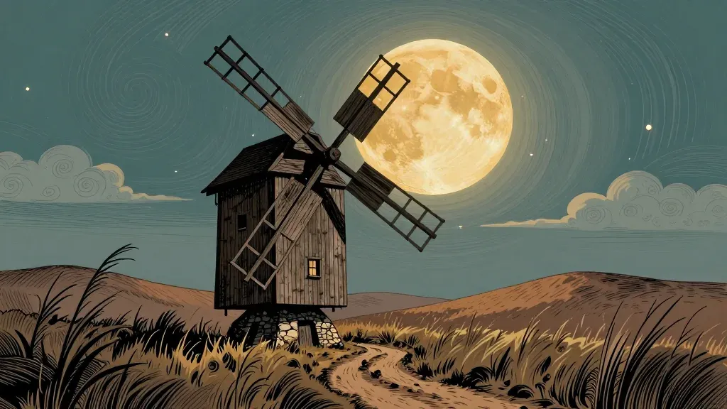 A rustic windmill stands crookedly in a grassy field, bathed in the warm glow of a full moon. The composition creates a sense of depth and tranquility, with long shadows and swirling clouds in the background.