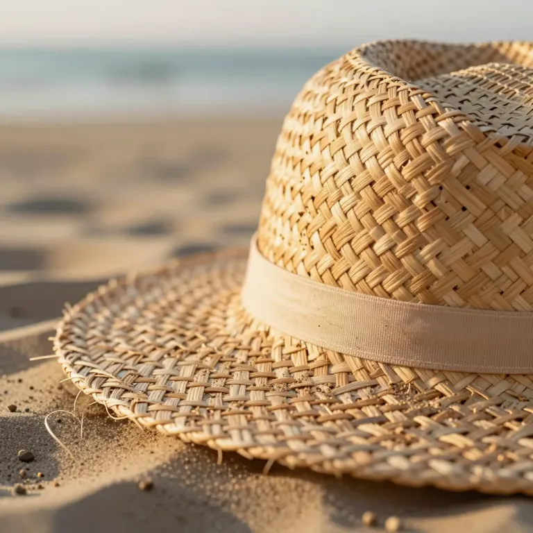 A close-up of a woven straw hat with a wide brim, bathed in golden sunlight, highlighting its intricate texture and sandy beige color. The blurred beach and ocean background provide a serene and natural setting, ideal for summer and travel themes.