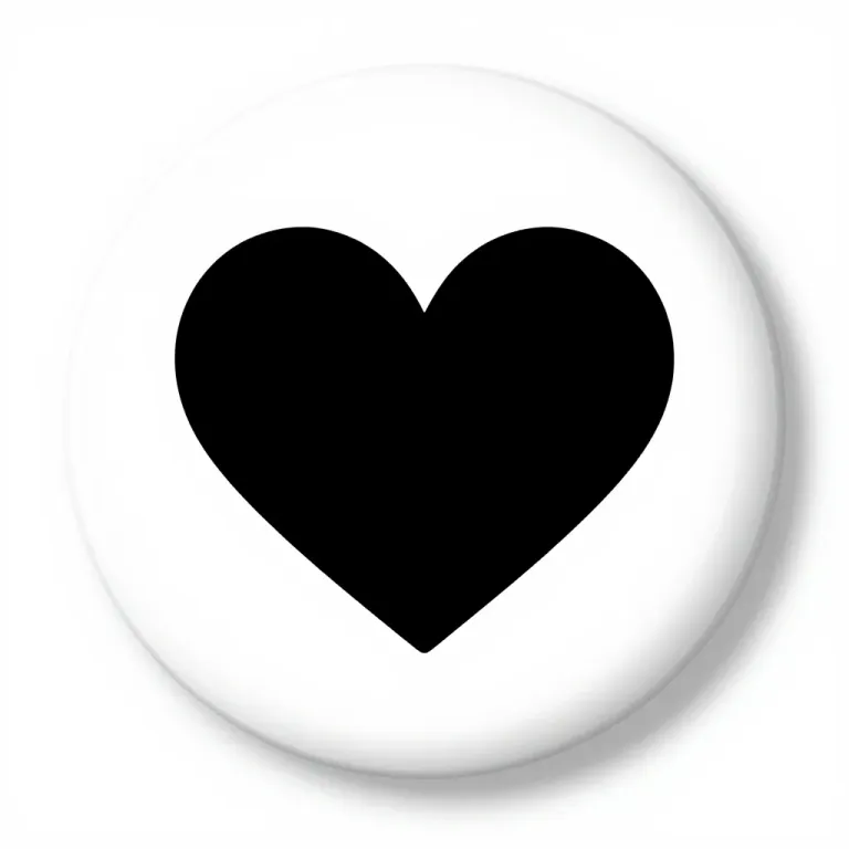 A glossy black heart-shaped badge is centered on a clean white surface, illuminated by soft, diffused light from above, creating a gentle glow and subtle shadows. The clean background provides a stark contrast, emphasizing the badge's sleek design and the interplay of light and shadow.