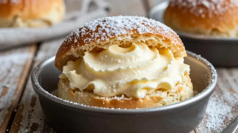 A close-up of a golden, flaky cream-filled brioche bun dusted with fine sugar, illuminated by soft, diffused light that highlights its textures and creamy filling. The rustic wooden background adds a cozy, homemade feel to the composition.