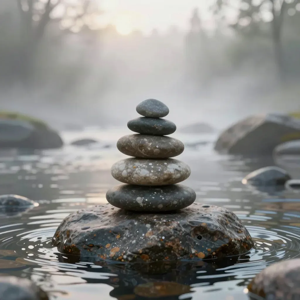 A serene stack of smooth, rounded stones balanced on a larger, rougher rock in a misty river setting, with soft, diffused light filtering through the fog creating a hazy, ethereal glow. The composition focuses on the stone stack, with the blurred, misty forest and river background providing depth and tranquility.