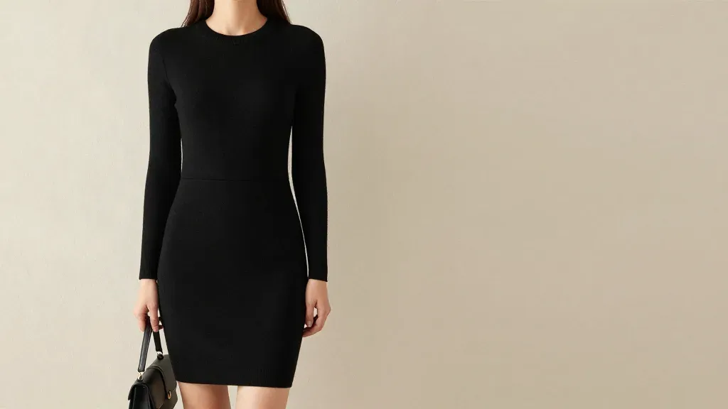 A woman in a sleek black knit dress holds a dark handbag, illuminated by soft, diffused light that creates gentle shadows and highlights. The minimalist, light beige background provides a clean, uncluttered setting with ample copy space.