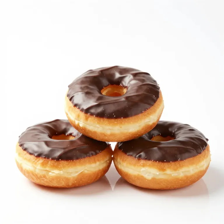 A pyramid of chocolate-glazed donuts with a glossy finish, softly lit from above, emphasizing the rich dark brown chocolate and golden-brown donut exterior against a clean white background.