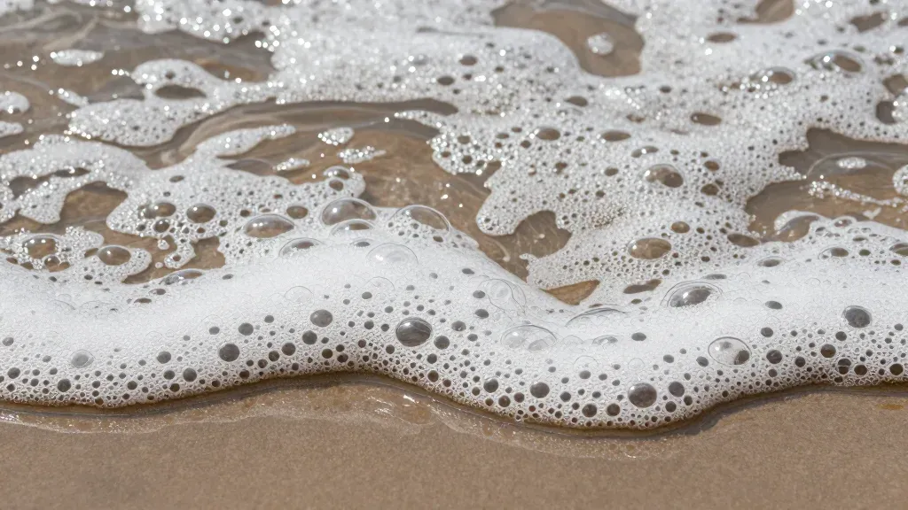 Close-up of frothy, glossy ocean foam with reflective highlights, set against a blurred sandy shore. Shallow depth of field isolates the foam, emphasizing its glossy texture and light brown tones.