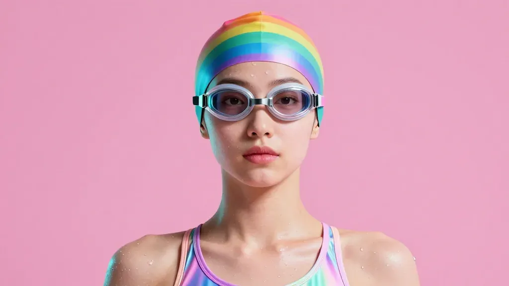 A swimmer in a rainbow-striped cap and pastel swimsuit, glistening with water droplets, under soft, diffused lighting. The solid pink background provides a clean and uncluttered backdrop, emphasizing the subject's vibrant attire and glossy texture.
