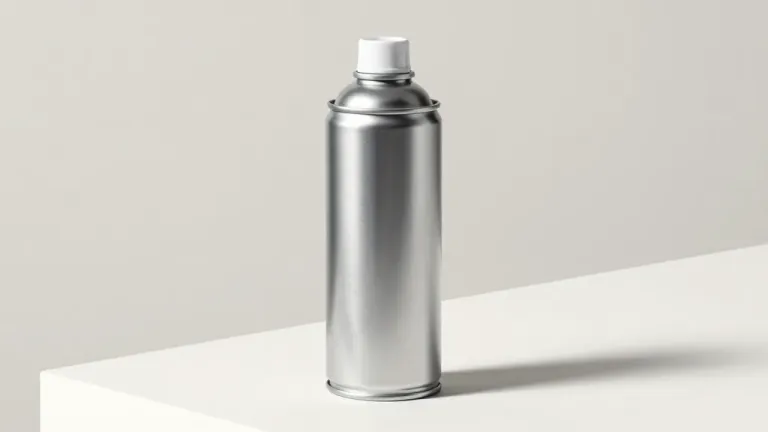 A smooth, reflective aluminum spray can sits centered against a clean, white background, illuminated by soft, diffused lighting that creates gentle highlights and shadows, emphasizing its sleek design and metallic texture.