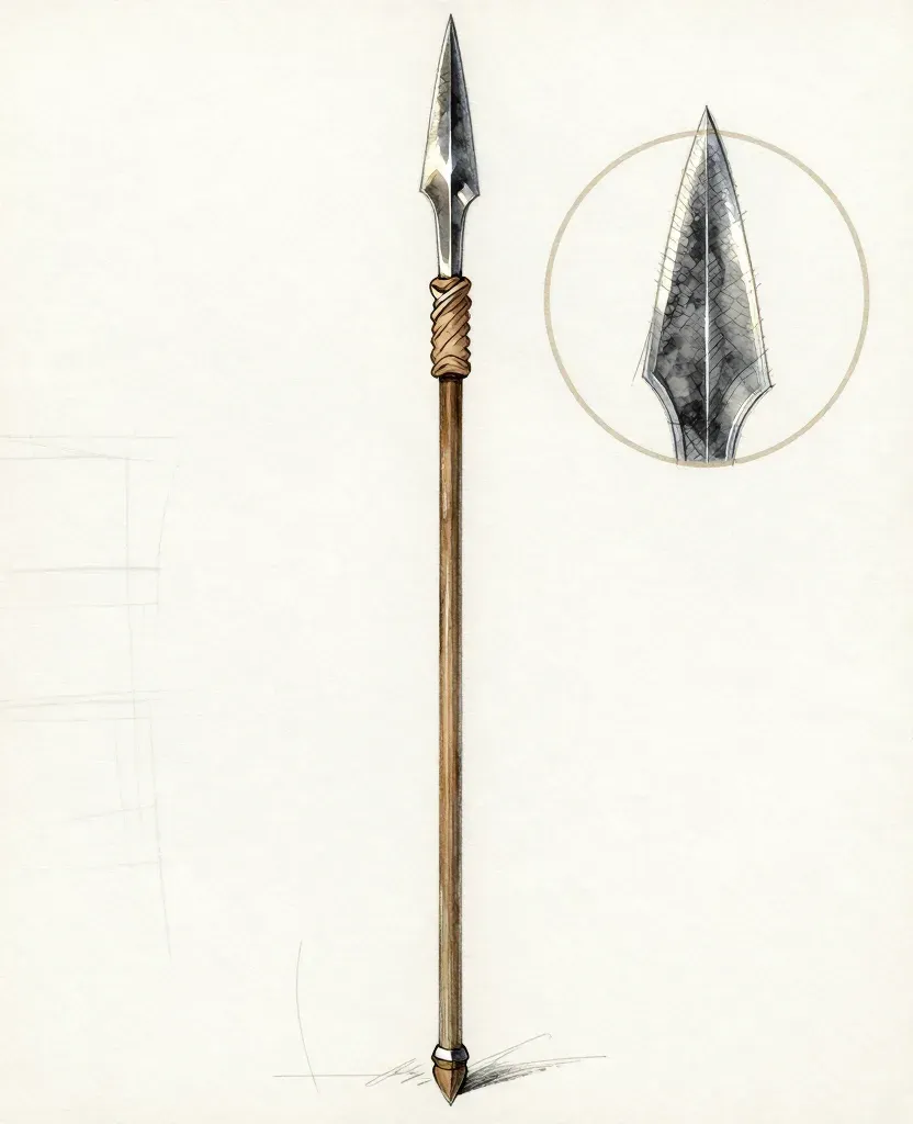A detailed illustration of a crescent-shaped spearhead with a wooden shaft, showcasing a glossy metallic sheen and rough cord wrapping. The soft, diffused lighting highlights the reflective surface and texture of the cord, set against a neutral, light beige background.