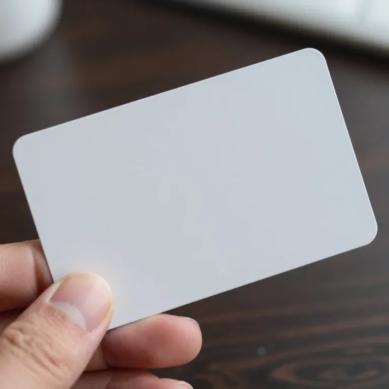 A hand holds a white credit card at an angle, showcasing its glossy plastic surface under soft, diffused lighting. The shallow depth of field and blurred dark background emphasize the card's smooth texture and the hand's skin tone.