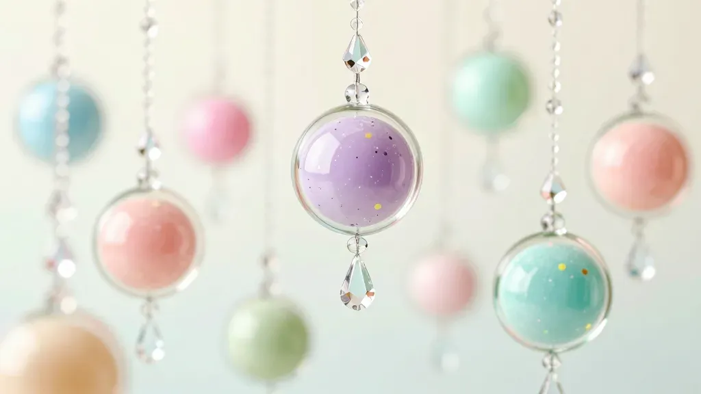 Pastel-colored candy-glass baubles suspended in mid-air, showcasing their glossy, smooth texture and speckled interiors, illuminated by soft, diffused lighting that highlights their reflective surfaces against a blurred, light-colored background.
