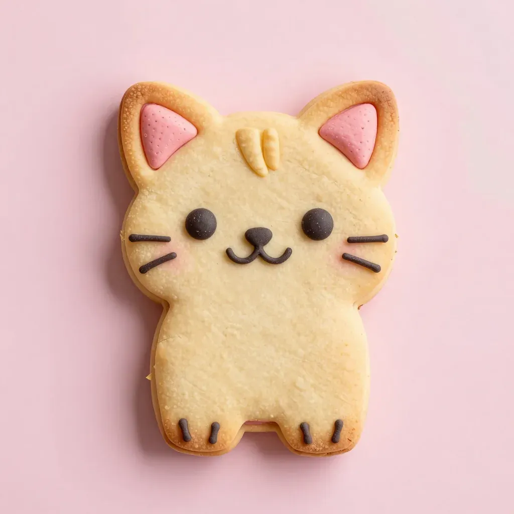 A cat-shaped cookie with glossy pink ears and dark brown eyes and nose, set against a soft, overhead-lit, clean pink background. The slight tilt and centered composition create a dynamic yet balanced frame, ideal for food and dessert imagery.