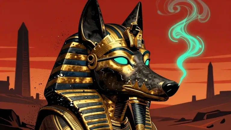 A jackal-headed pharaoh with glossy metallic scales and a polished gold headdress stands against a warm, golden sunset, with an ancient city blurred in the background. The dramatic lighting and shallow depth of field emphasize the pharaoh's regal presence.