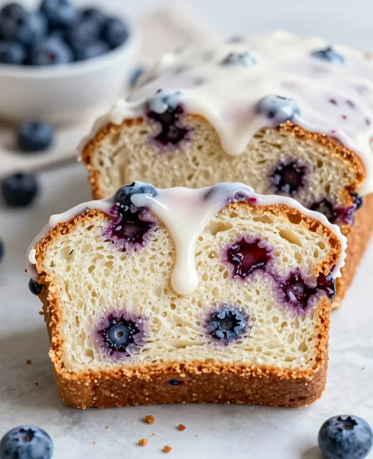 #blueberry#iced loaf cake#sliced#glossy icing#soft texture#golden-brown crust#juicy blueberries#warm lighting#close-up#food photography