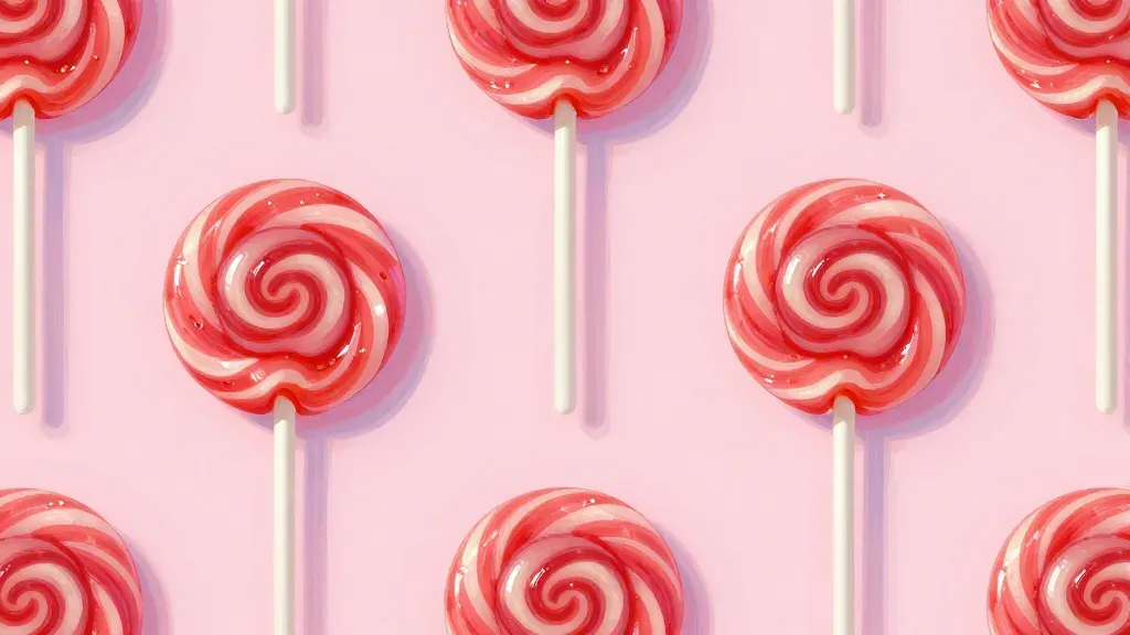 A top-down view of lollipops with red and white swirls, showcasing their glossy, creamy texture under diffused, soft lighting. The evenly spaced lollipops create a grid-like pattern against a blurred, out-of-focus soft pink background, emphasizing the lollipops and providing ample copy space.