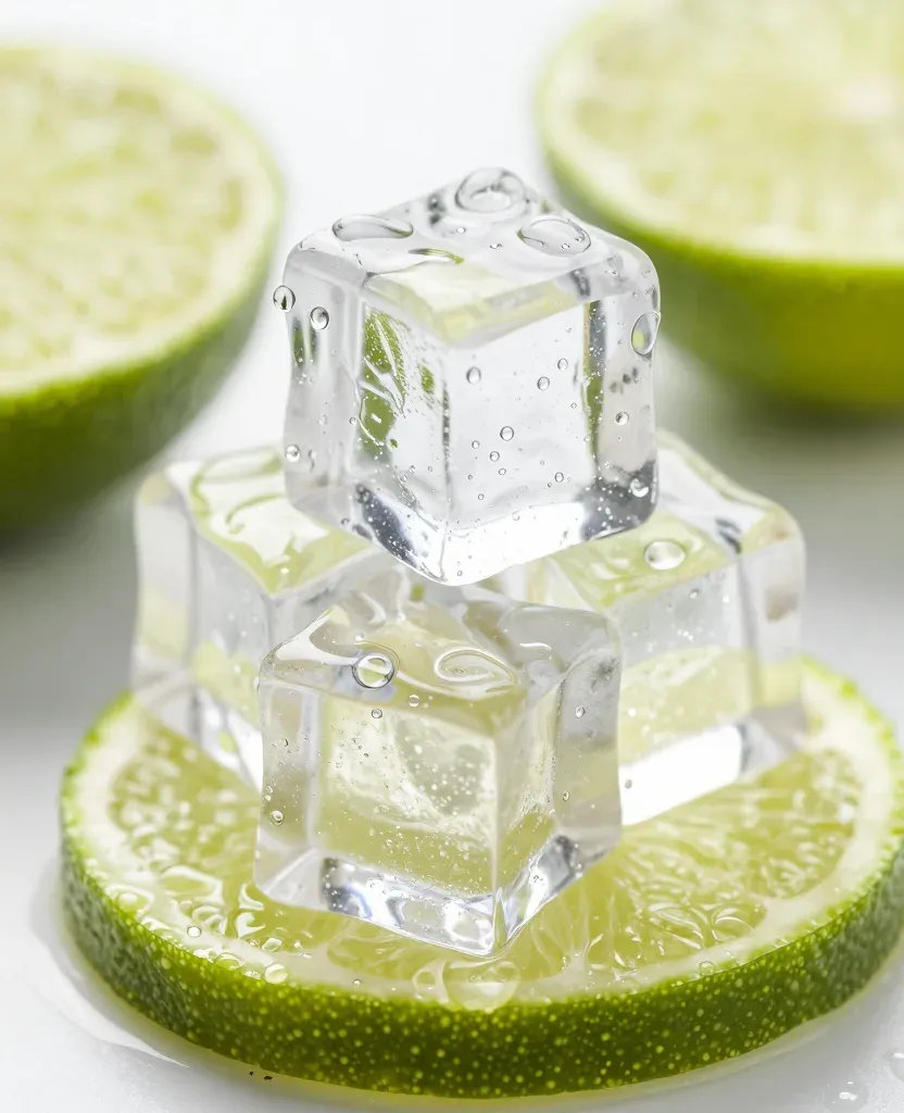 A pyramid of ice cubes is stacked on lime slices, illuminated by bright, diffused light from above, creating highlights on the ice and lime. The blurred background with soft focus on the lime slices emphasizes the ice cubes in the foreground.