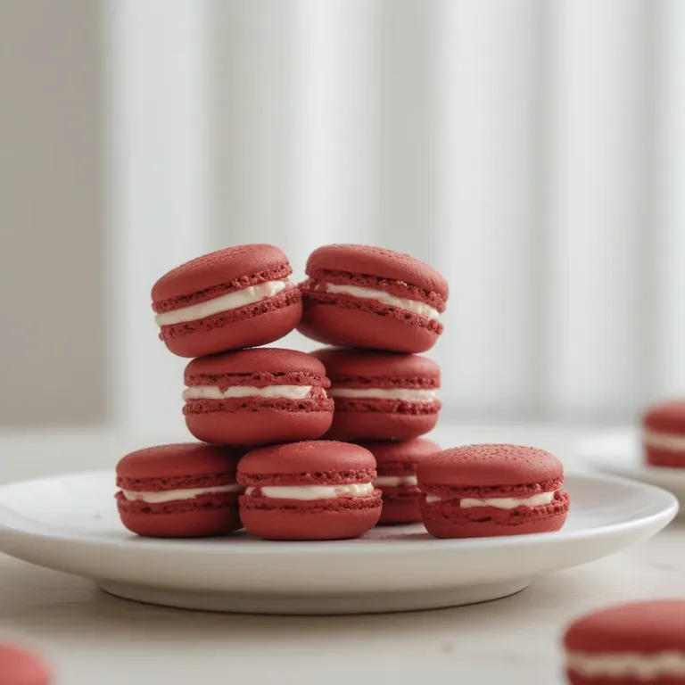 Vibrant red macarons with glossy shells and creamy filling are artfully stacked on a white plate, illuminated by soft, diffused light that enhances their glossy texture and vibrant color. The clean, minimalist background with blurred white curtains provides a perfect backdrop, emphasizing the macarons' elegant presentation.