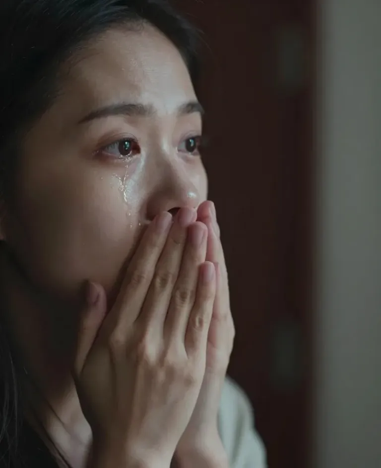 A woman stands in a doorway, covering her mouth and cheeks with glossy tears, her hands slightly rough. Soft, diffused lighting highlights her facial features against a neutral, blurred background.