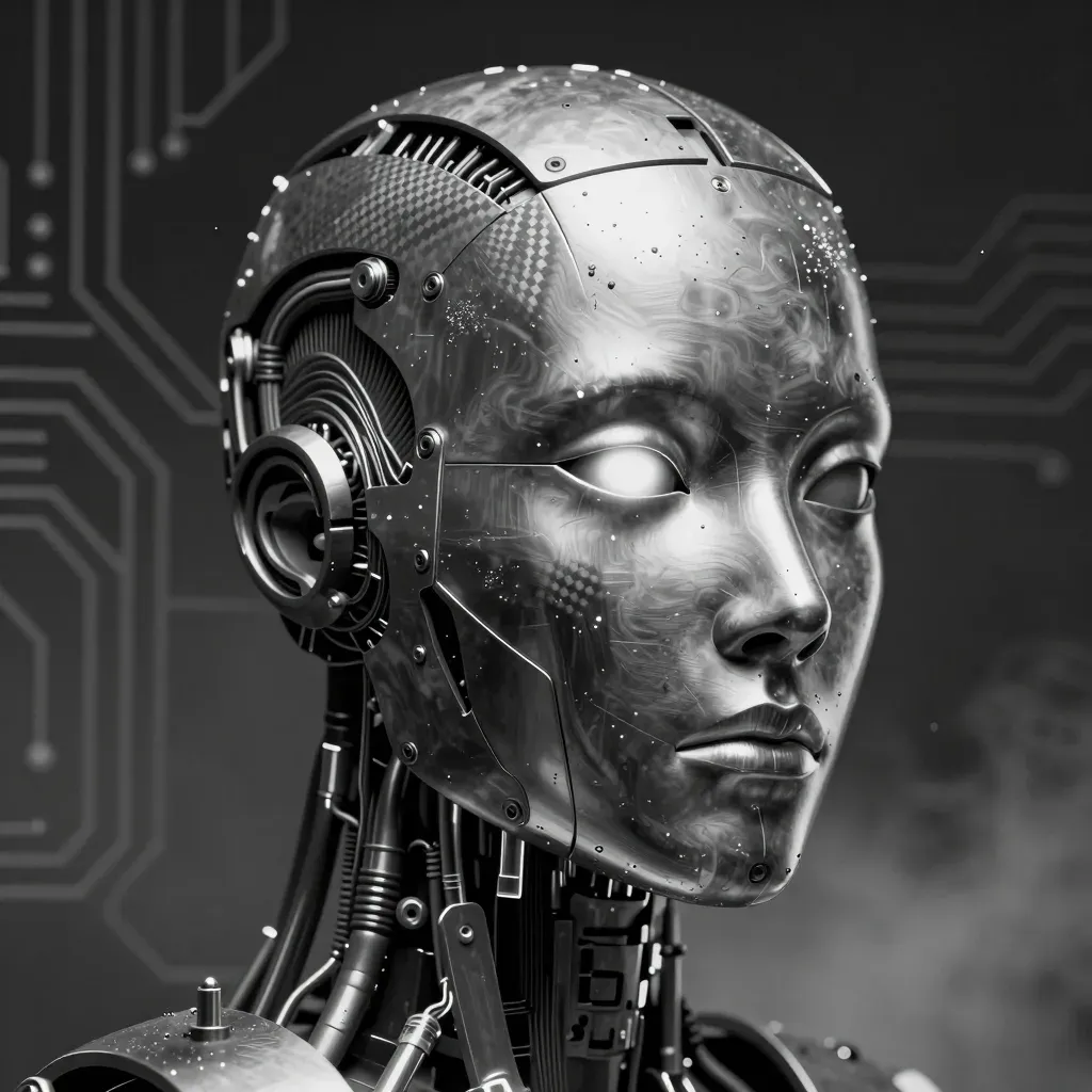 A close-up of a cybernetic android face with intricate metallic circuitry and glossy skin, illuminated by soft directional lighting that highlights the mechanical details. The blurred circuit board background adds depth and context to the futuristic subject.