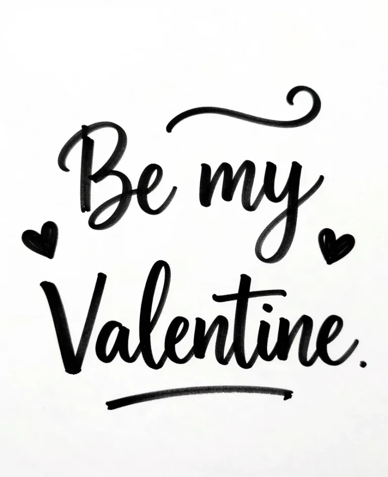 A soft, overhead light highlights the glossy black ink of the handwritten text 'Be my Valentine' against a clean white background, creating a romantic and elegant mood. The centered composition and symmetrical hearts add balance and visual interest, making it ideal for Valentine's Day greetings or romantic designs.