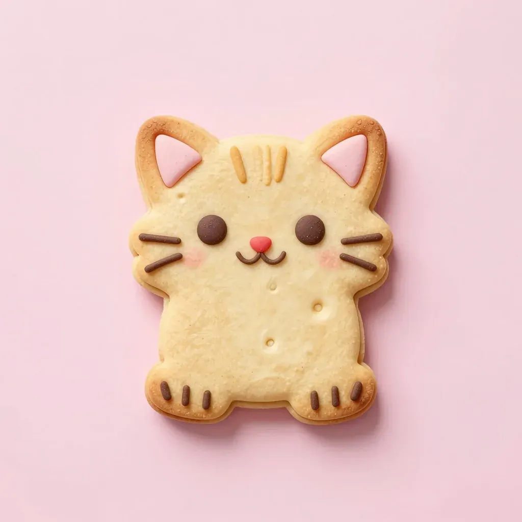 A golden cat-shaped cookie adorned with pink and brown icing, set against a soft pink background, creating a charming and appetizing visual. The gentle highlights and centered composition emphasize the cookie's details and texture.