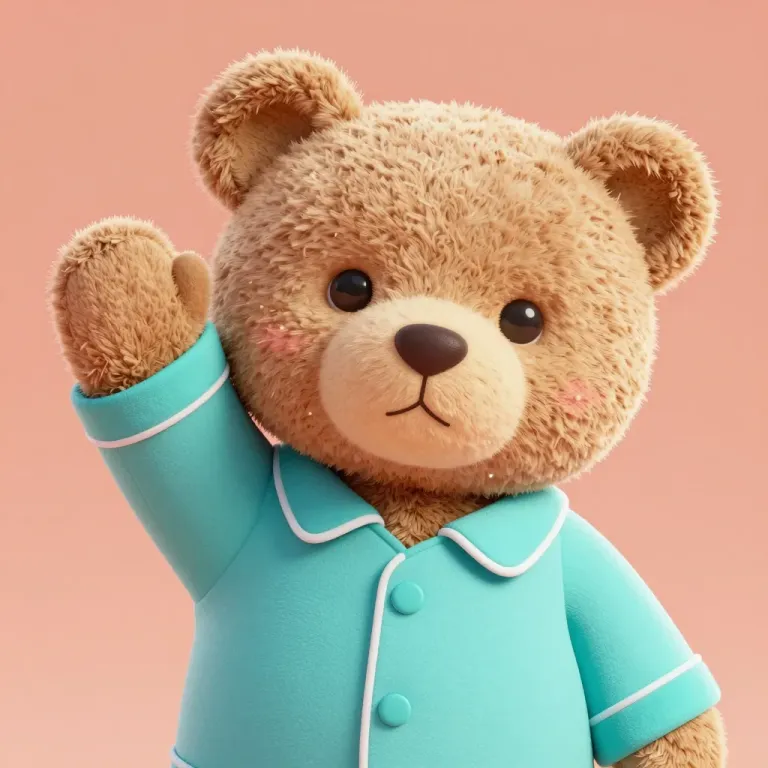 A plush teddy bear dressed in teal pajamas waves with one paw, set against a soft, diffused light that highlights the folds of the pajamas and the bear's friendly expression. The solid pink background provides a simple, unobtrusive backdrop with ample copy space.