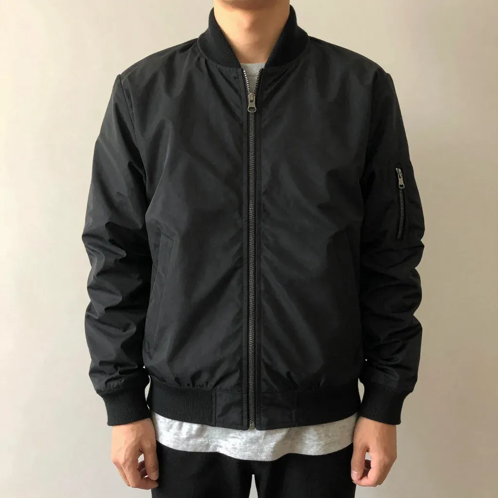 A model wears a glossy black bomber jacket with ribbed cuffs and hem, highlighted by frontal, even lighting. The neutral beige background provides a clean, uncluttered backdrop.