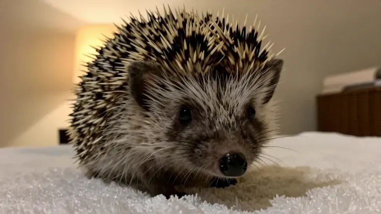 A hedgehog rests on a white towel, its spines sharp and its face soft and fluffy. The warm, diffused lighting highlights the textures and creates a cozy, homey atmosphere.