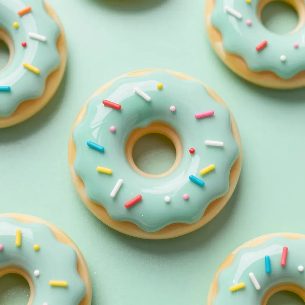 A close-up of a glossy donut medallion with multicolored sprinkles, softly lit to highlight the glaze and texture, set against a clean, solid light blue background with a shallow depth of field.