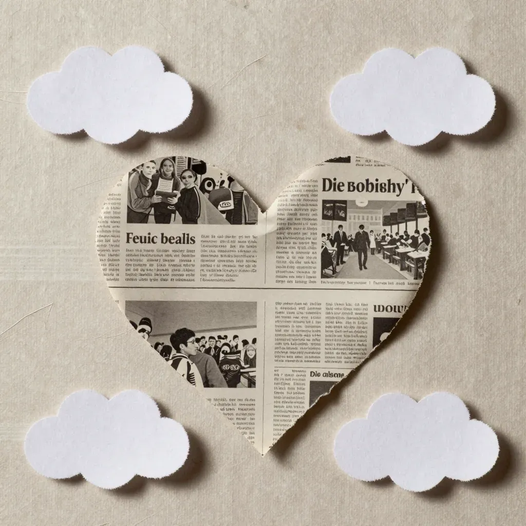 A heart shape is formed by newspaper clippings, with white clouds framing the top and bottom, set against a soft, diffused light that creates gentle shadows and highlights. The neutral beige background provides a clean backdrop, allowing the heart and clouds to stand out prominently.