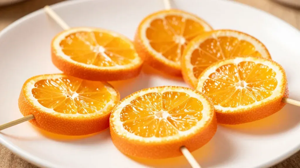 Six glossy candied orange slices with crystalline sugar coating are skewered on natural wood sticks and arranged in a circular pattern on a white plate. Soft directional lighting from the upper left highlights the sugar crust and creates shallow depth of field, emphasizing the central slice against a blurred neutral background.