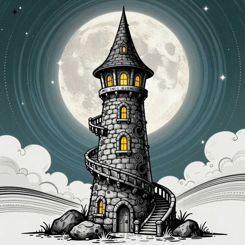 A mystical spiral stone tower stands illuminated by ethereal moonlight, casting a warm glow through its glossy windows against a swirling starry sky. The composition centers the tower, creating a sense of depth and enchantment.