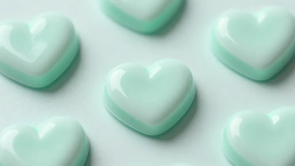 Close-up of glossy, translucent mint green heart-shaped candies, illuminated by direct overhead light that creates highlights and reflections, set against a blurred white background to emphasize the candies' texture and color.
