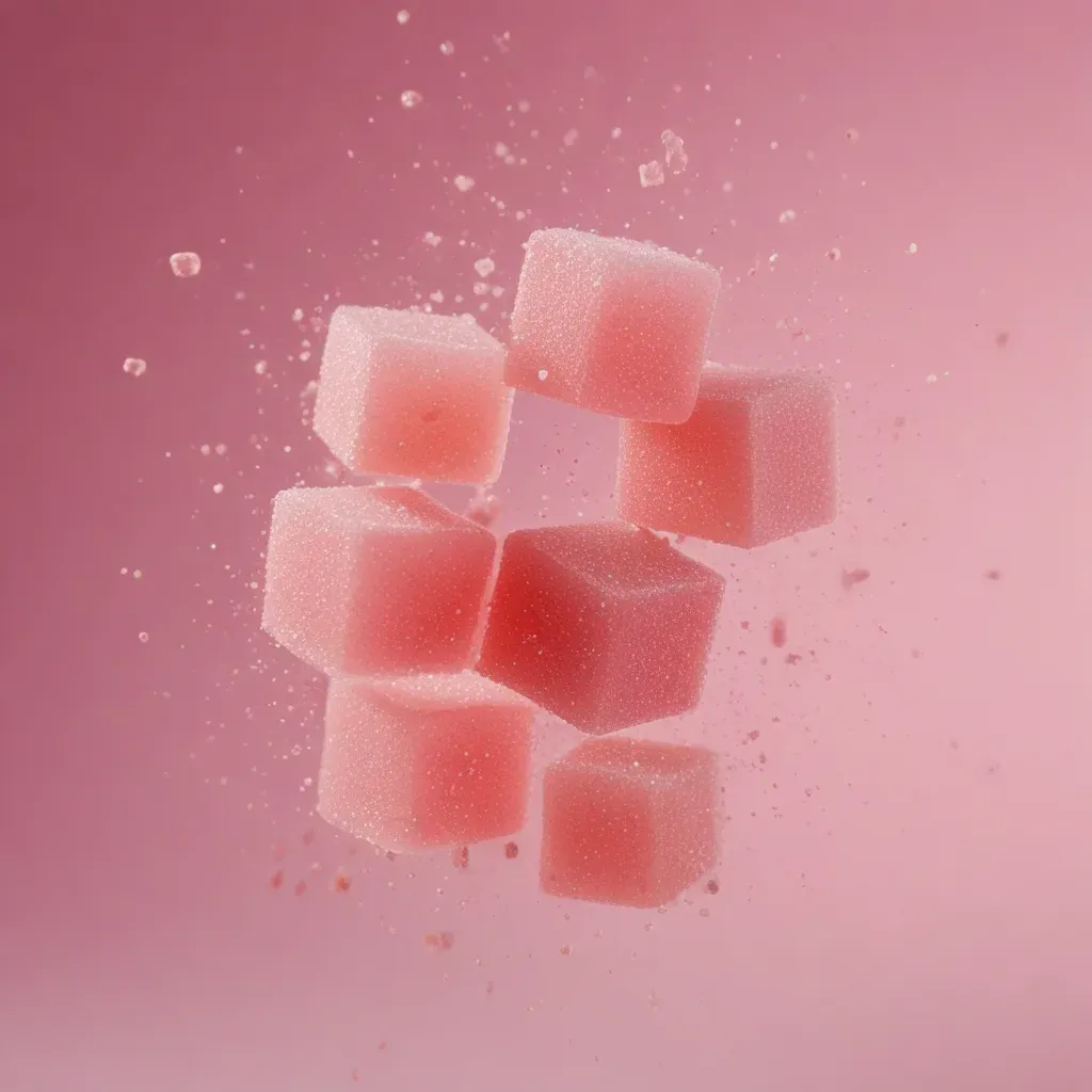 Translucent pink candy cubes suspended mid-air, reflecting soft light and sugar crystals, creating a sense of levitation against a blurred pink gradient background. The diffused lighting and shallow depth of field emphasize the glossy texture and vibrant color of the candy.