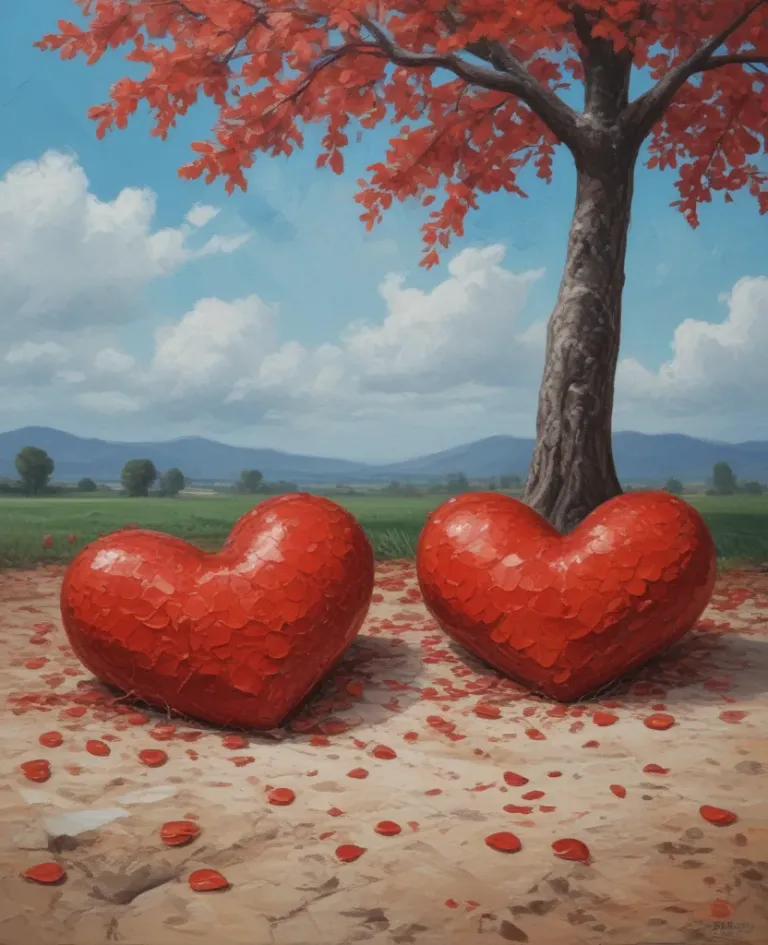 Two large, glossy red hearts rest on a stone path beneath a tree with vibrant red leaves, surrounded by scattered petals. The soft, diffused sunlight enhances the warm and inviting glow, creating a serene and romantic atmosphere.