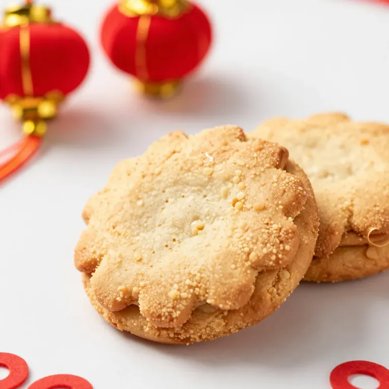 A freshly baked cookie with a sugar-coated surface, highlighted by soft, diffused light that creates a sparkling effect. The close-up shot with a blurred background of red lanterns emphasizes the cookie's texture and adds a festive atmosphere.