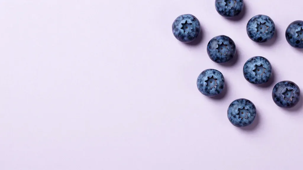 Deep blue blueberries are scattered on a soft, diffused light creates subtle highlights and shadows, creating a serene and natural composition. The solid lavender background provides a clean and uncluttered setting, ideal for product photography or food styling.