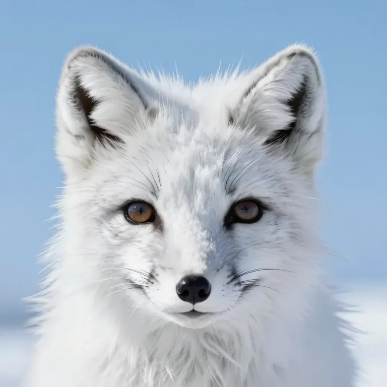 A close-up of an Arctic fox with soft, fluffy white fur and glossy amber eyes, illuminated by diffused, soft light that highlights the texture and creates a clean, blurred pale blue sky background. The shallow depth of field draws attention to the fox's face, offering ample copy space for text or design elements.