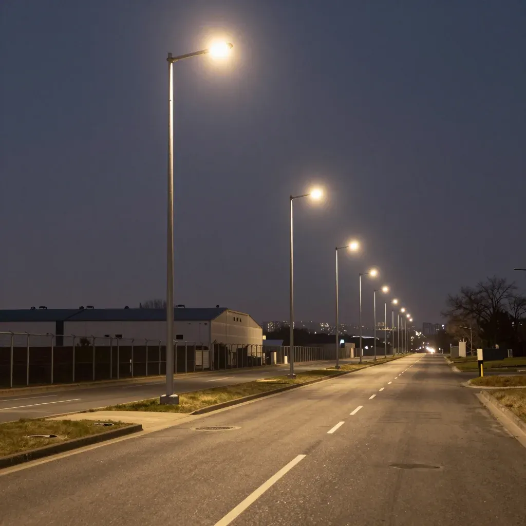 Warm streetlights cast a golden glow on a smooth asphalt road, leading the eye into the distance, framed by industrial buildings and a cool blue sky. The linear perspective and soft reflections highlight the road's texture and the streetlamps' symmetry.