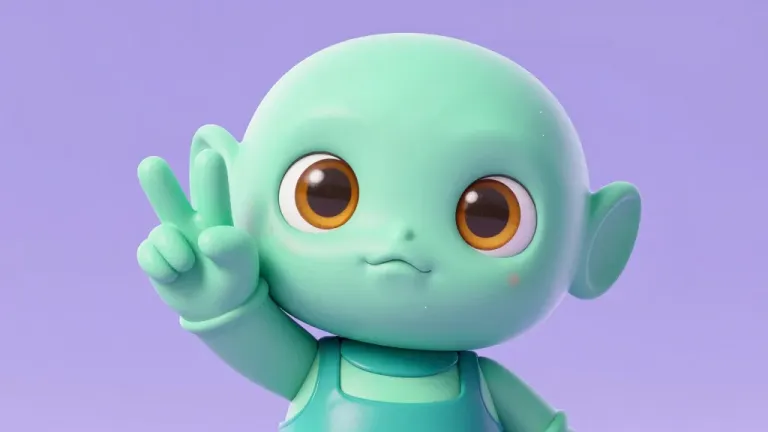 A glossy green alien kid peeks out from behind a rough green leaf against a soft, diffused purple gradient background. The shallow depth of field highlights the subject with gentle shadows, creating a whimsical and playful mood.