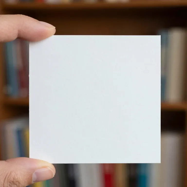 A hand gently holds a smooth, glossy white card against a softly lit, blurred bookshelf background. The diffused lighting creates a warm, inviting atmosphere with a shallow depth of field, emphasizing the card and hand while the background remains out of focus.