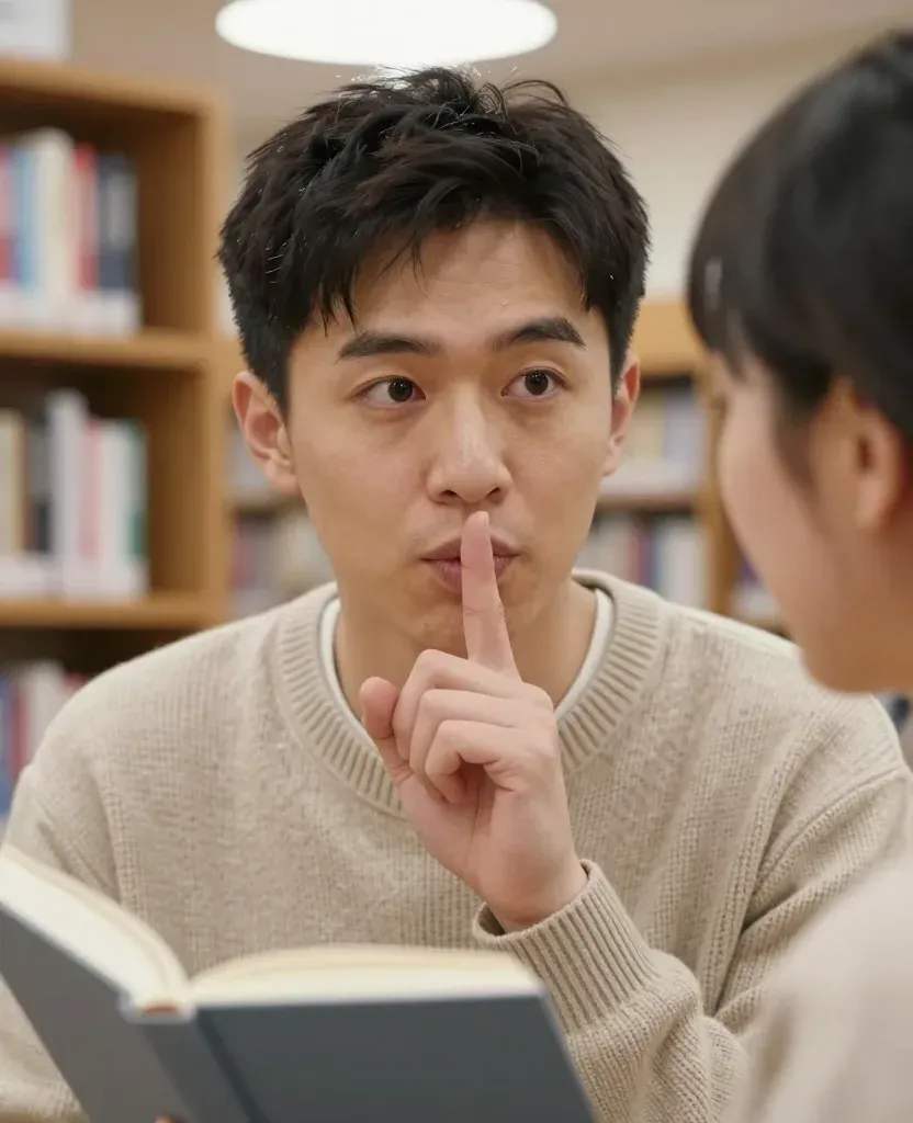 A young man, wearing a beige sweater, holds a book and presses his finger to his lips in a shushing gesture, set against a softly lit, blurred background of bookshelves. The warm, diffused lighting highlights the texture of his sweater and the slightly frayed edges of the book pages.