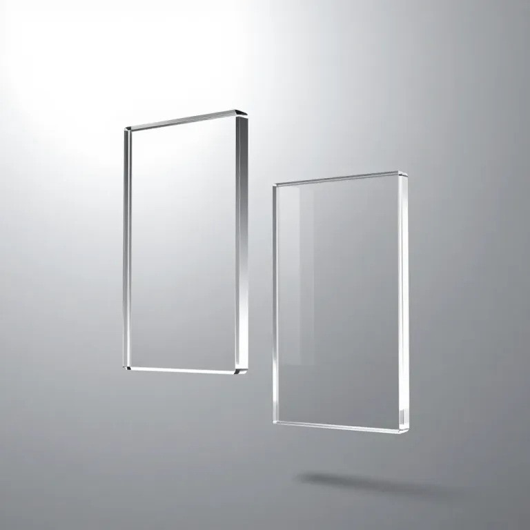 Two translucent acrylic blocks drift diagonally against a smooth gradient gray background, creating a sense of depth and highlighting their glossy, smooth texture. The diffused, soft lighting from above accentuates the reflections and highlights on the blocks, emphasizing their clarity and translucency.