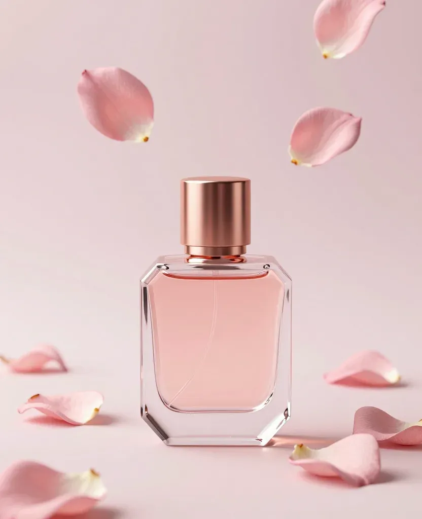A crystal perfume bottle with a rose-gold cap is centered against a soft, diffused light background, creating gentle highlights and reflections. The scattered rose petals add depth and a romantic touch to the composition.